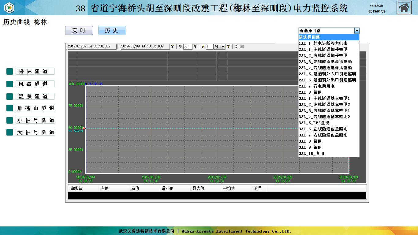 历史曲线按区域划分子项,点击进入之后,勾选需要显示的对象,一般为电流、电压、功率、温度等,通过设置查询时间,可以将时间段内的数据查询出来以曲线的形式进行显示,并可以对X轴、Y轴进行缩放功能,便于对曲线数据进行分析。