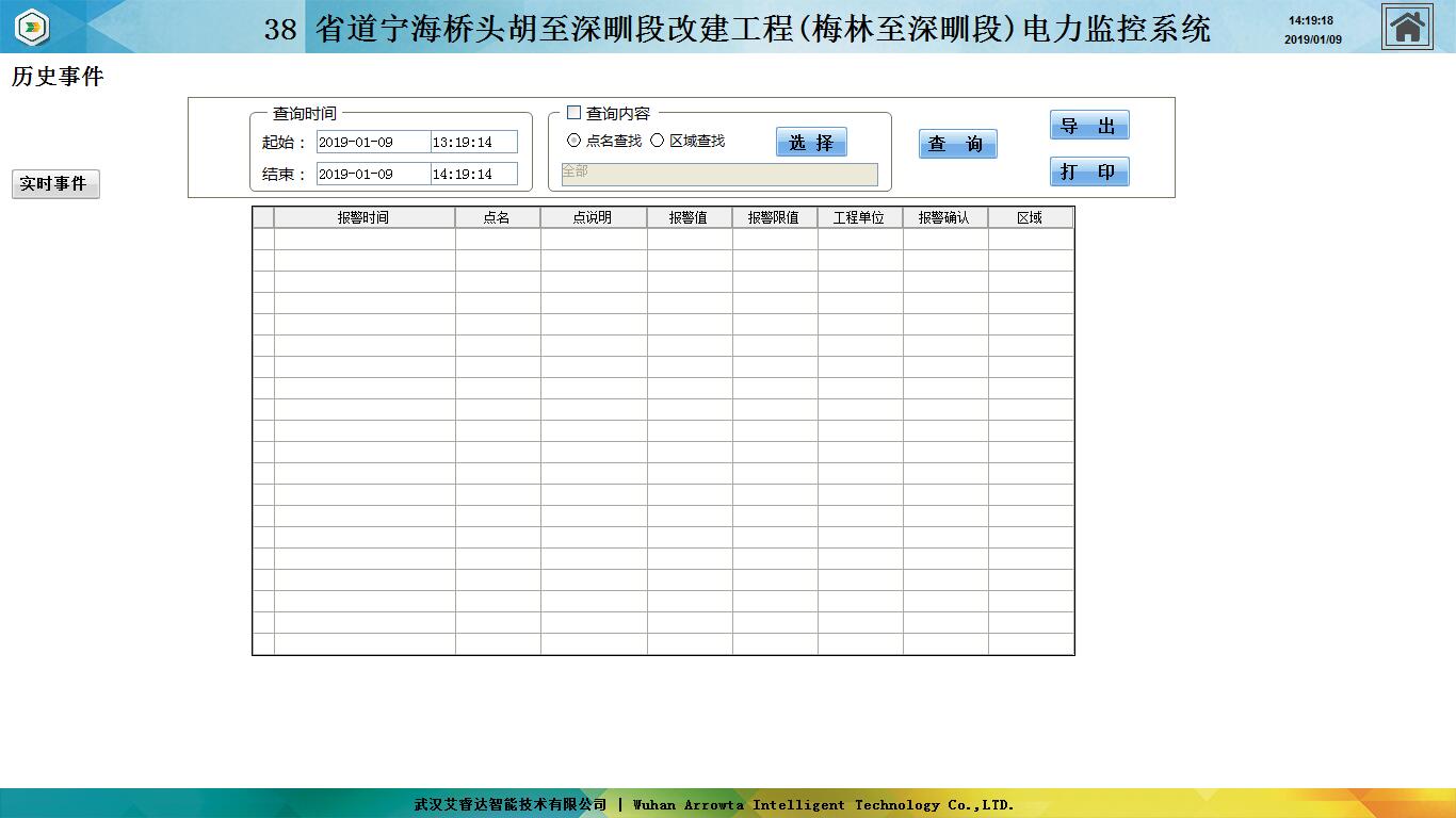 事件查询时对报警的存盘信息进行历史查询的功能,按设备类型分类,可以查询输入时间段的历史报警信息,进行事件追忆,达到分析和记录的目的,可以导出到excel表。