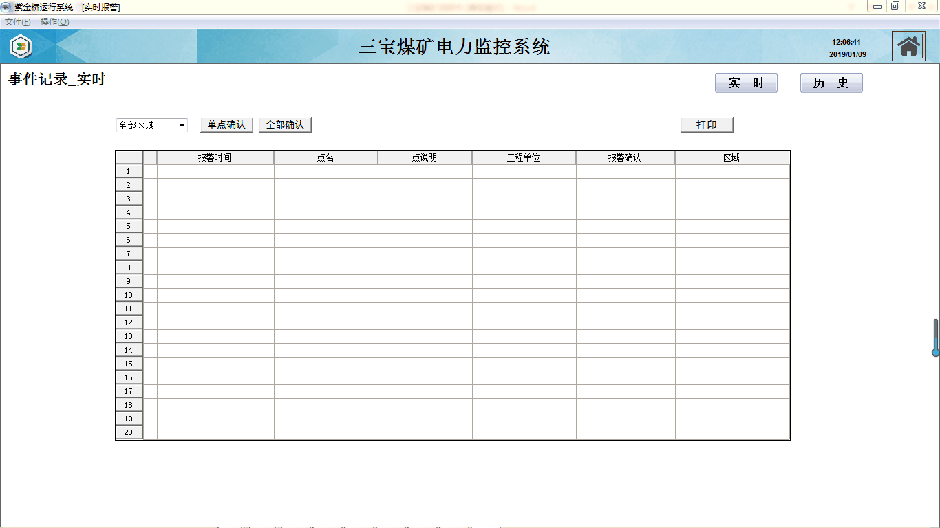 配电监控系统可在任何时间在显示屏上通过弹出报警窗口方式显示最新的报警信号和提示,及时反映事故报警,并产生报警声音(用户可以指定在某些事件发生时或保护动作时自动发出报警)包括音响报警,语音报警,警铃报警。报警分模拟量报警和开关量报警,报警讯号一旦发出将持续不断直到有值班人员来处理并按报警取消或复归键。报警信号按时间先后顺序排队,报警信号分红黄两种颜色显示不同的报警级别,并用闪烁和不闪烁来区别某一报警是否已确认或已处理。所有报警信息均存储在事件记录中,作为对该报警之事后分析依据。