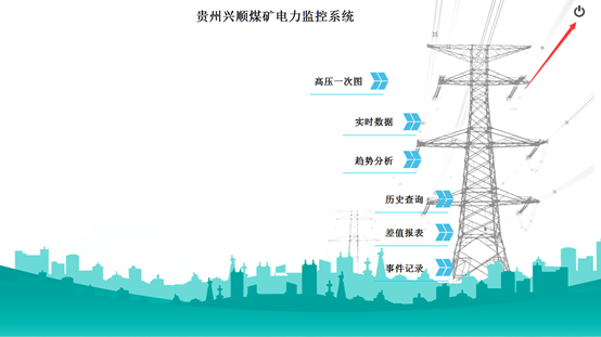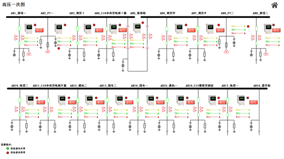 主界面连接所有的操作界面,进入子项的系统主接线图。系统主接线根据系统设计图纸,还原系统结构,并将实时信息进行显示,点击任一显示项,可以进入查询设备各项详细信息。