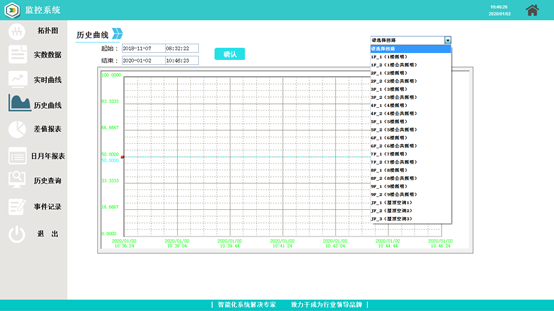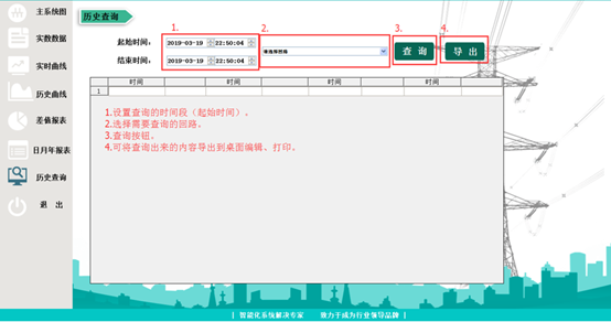 历史查询是通过设置查询时间,选择需要查询的回路,可以将时间段内该回路的数据查询出来。以table表、按接线回路方式呈现,清晰、直观的监测仪表完整显示系统设备的某一时间段监测信息,历史信息。