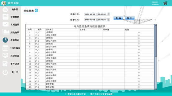 差值报表是按时间段来查询该时间段内的耗电量,并可将查询的结果导出,界面如下: