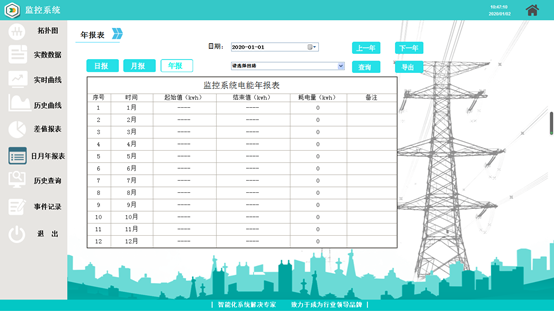 年报表,可以通过设定日期,以及回路来查询当年每月的抄表值和耗电量。以年为周期,查询日期建议设定起始时间为每年的1月1号。