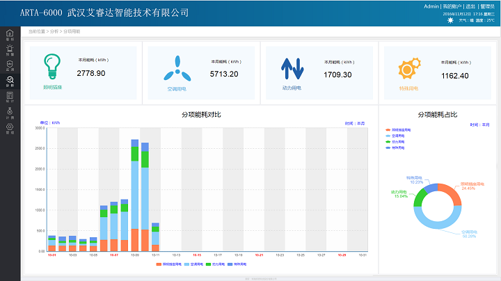 a.综合能耗信息,包括环境参数、实时负荷、日/月/年能耗量、能耗组成饼图、能效指标。