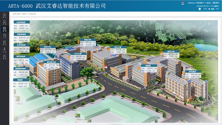 系统可导入建筑导航地图,通过鼠标移动可以看到各栋建筑的信息和总体能耗状况。点击进入之后可以看到该栋建筑内各区域的详细能耗状况。