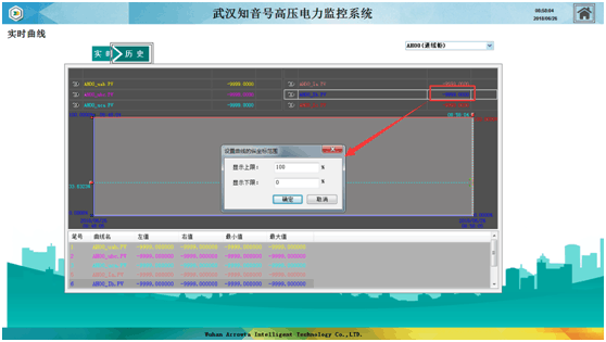 历史曲线基本操作与实时操作相同。有区别的是可以在如图标记的查询条件设置栏内选择查询条件,设置起始时间,曲线按百分比左右移动,以及设定曲线的上限值。