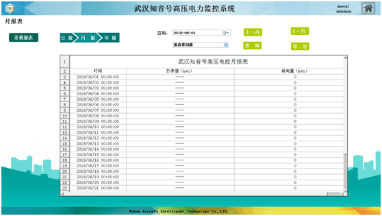 月报表,可以通过设定日期,以及楼层回路来查询当月每天的抄表值和耗电量。以月为周期,查询日期建议设定起始时间为每个月的1号。(截止时间为30/31)