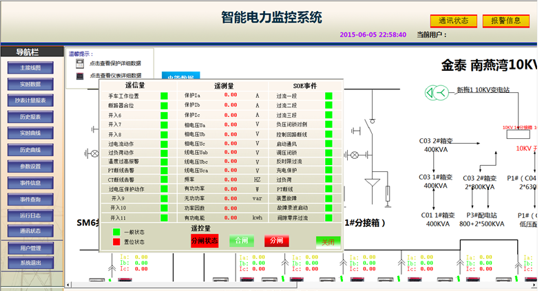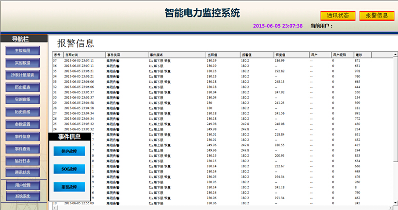 事件信息分为保护故障信息,SOE信息,报警信息,实时显示设备的故障状态,具有不同的颜色显示,也可以弹出报警框,并可以播放报警声音,或驱动警铃警笛等。