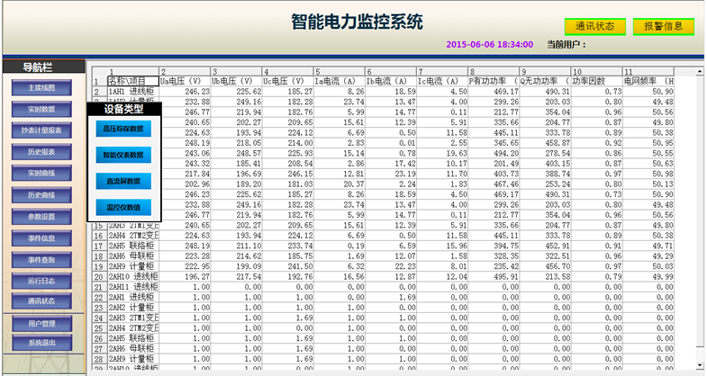实时数据是完整显示系统设备的实时监测信息,按设备类型分成多个二级子项,如电力仪表、继电保护、直流、温控仪等。用table表、按接线回路方式呈现,清晰、直观的监测仪表实时信息。