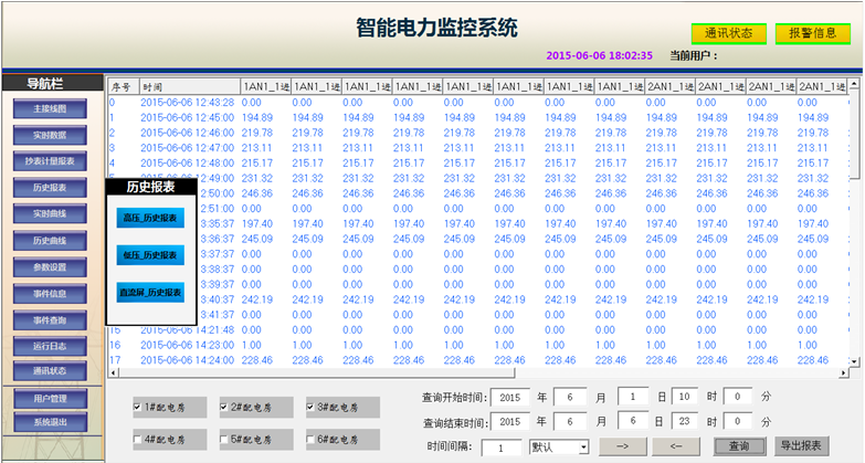 历史报表按区域划分子项,点击进入之后,可以勾选需要查询的对象,设置查询日期,即可查询历史数据,并可以导出到excel作为数据分析的依据。