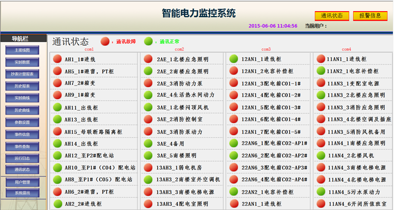 通信状态通过一览表的形式,通过红色、绿色的颜色区分,实时监视设备的通信状态,当通信出现故障,就需要提示运行值班人员,进行设备故障或通信故障的排查,确保监控系统的设备和通信处于正常状态。