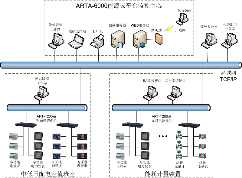 ARTA-6000建筑能源管理系统,采用分层部署的思想,每一层硬件设备均按照国家标准和维护简易性进行安装,并充分考虑系统的可扩展性进行配置和布局。系统三层结构分别为应用管理层、通讯网络层和设备层,系统网络架构如图。