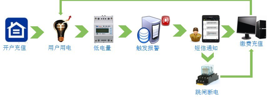 网络预付费电能表中保存有用户的购电量信息,电表实时扣减用户购电量,低余额短信自动提醒,恶性负载自动识别,一旦用户购电量为零,电表即拉闸断电,停止电力供应;用户再次购电后,即可自动合闸供电,不需要电费催收,可不需要人工插卡,一站式服务,减少物业人员的工作量降低安全隐患。